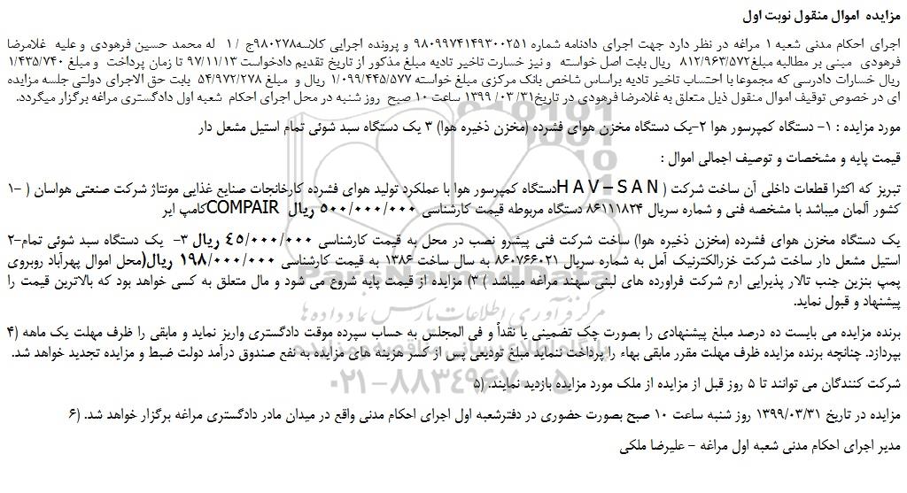 2-یک دستگاه مخزن هوای فشرده (مخزن ذخیره هوا) ساخت شرکت فنی پیشرو نصب در محل به قیمت کارشناسی 45/000/000 ریال 3- یک دستگاه سبد شوئی تمام استیل مشعل دار ساخت شرکت خزرالکترنیک آمل به شماره سریال 860766021 به سال ساخت 1386 به قیمت کارشناسی 198/000/000 ریال(محل اموال پهرآباد روبروی پمپ بنزین جنب تالار پذیرایی ارم شرکت فراورده های لبنی سهند مراغه میباشد ) 3) مزایده از قیمت پایه شروع می شود و مال متعلق به کسی خواهد بود که بالاترین قیمت را پیشنهاد و قبول نماید.