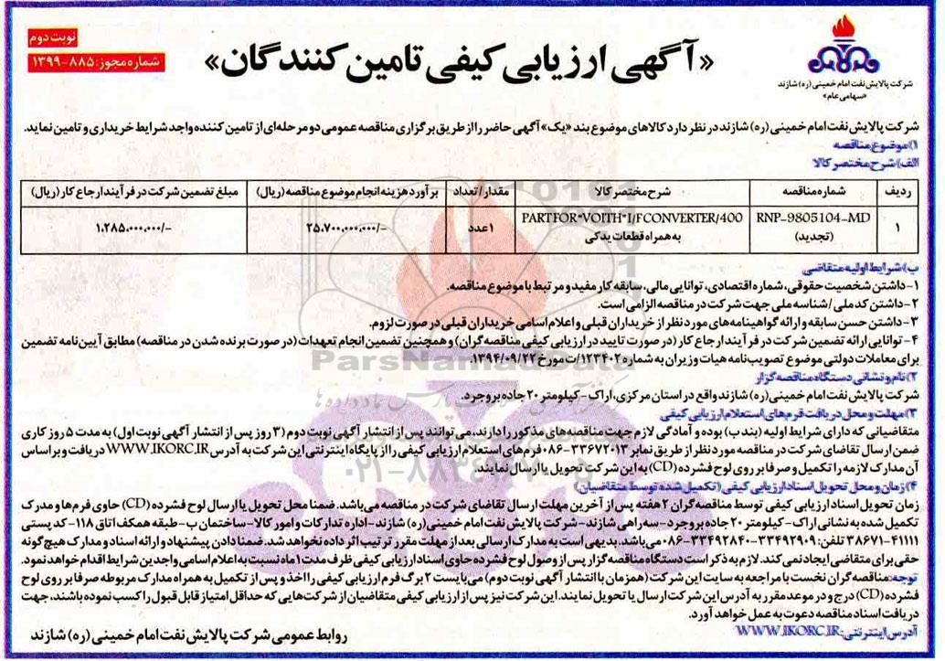 تجدید ارزیابی کیفی PART FOR VOITH I/F CONVERTER /400 - نوبت دوم از کلیه افراد متخصص و شرکتها واجد شرایط دعوت به عمل میآید در مناقصه با کد خبرگزاری پارس نماد: 2426203 شرکت نمایند.