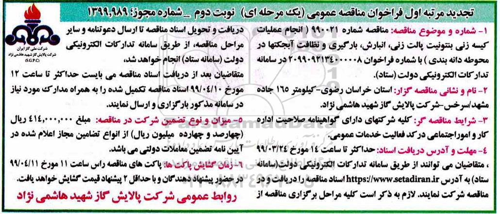 1- شماره و موضوع مناقصه: مناقصه شماره 990021 (انجام عملیات کیسه زنی بنتونیت پالت زنی، انبارش، بارگیری و نظافت آبجکتها در محوطه دانه بندی) با شماره فراخوان 2099092134000008 در سامانه تدارکات الکترونیکی دولت (ستاد)