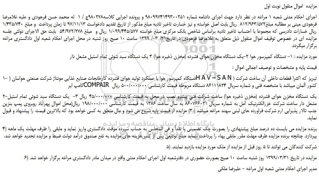 2-یک دستگاه مخزن هوای فشرده (مخزن ذخیره هوا) ساخت شرکت فنی پیشرو نصب در محل به قیمت کارشناسی 45/000/000 ریال 3- یک دستگاه سبد شوئی تمام استیل مشعل دار ساخت شرکت خزرالکترنیک آمل به شماره سریال 860766021 به سال ساخت 1386 به قیمت کارشناسی 198/000/000 ریال(محل اموال پهرآباد روبروی پمپ بنزین جنب تالار پذیرایی ارم شرکت فراورده های لبنی سهند مراغه میباشد ) 3) مزایده از قیمت پایه شروع می شود و مال متعلق به کسی خواهد بود که بالاترین قیمت را پیشنهاد و قبول نماید.
