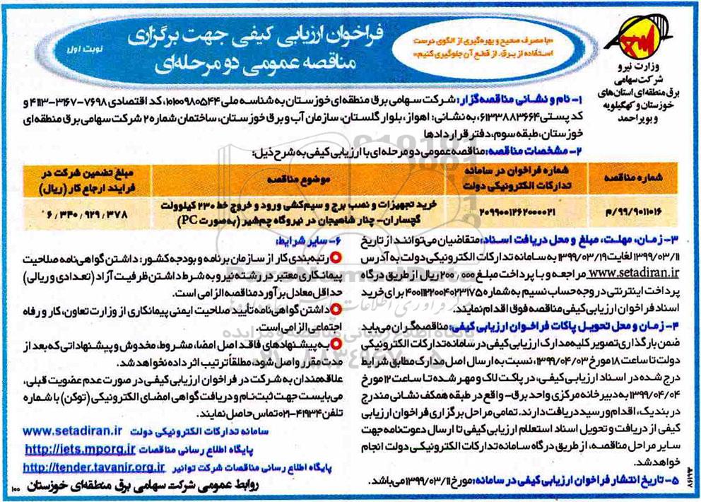 | 99/9011016/ م | 2099001262000021 | خرید تجهیزات و نصب برج و سیم کشی ورود و خروج خط 230 کیلوولت گچساران - چنار شاهیجان در نیروگاه چم شیر (به صورت pc) | 6.340.929.378 |