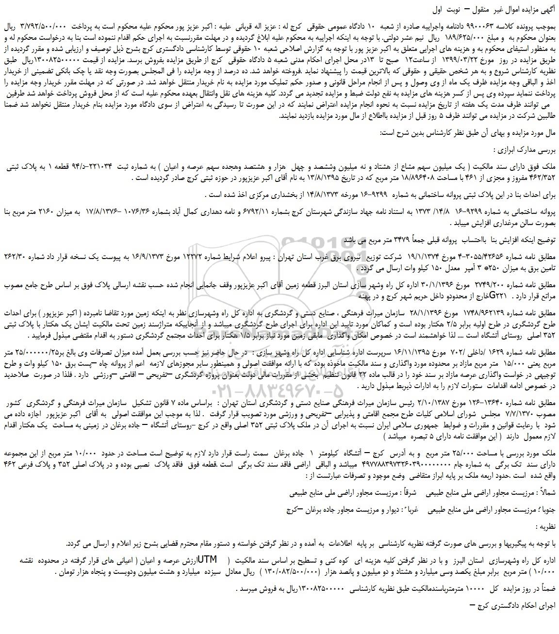بموجب پرونده کلاسه 9900063 دادنامه واجراییه صادره از شعبه 10 دادگاه عمومی حقوقی کرج له : عزیز اله قربانی علیه : اکبر عزیز پور محکوم علیه محکوم است به پرداخت 3/792/500/000 ریال بعنوان محکوم به و مبلغ 189/625/000 ریال نیم عشر دولتی. با توجه به اینکه اجراییه به محکوم علیه ابلاغ گردیده و در مهلت مقررنسبت به اجرای حکم اقدام ننموده است بنا به درخواست محکوم له و به منظور استیفای محکوم به و هزینه های اجرایی متعلق به اکبر عزیز پور با توجه به گزارش اصلاحی شعبه 10 حقوقی توسط کارشناسی دادگستری کرج بشرح ذیل توصیف و ارزیابی شده و مقرر گردیده از طریق مزایده در روز مورخ 1399/03/22 از ساعت12 صبح تا 13در محل اجرای احکام مدنی شعبه 5 دادگاه حقوقی کرج از طریق مزایده بفروش برسد. مزایده از قیمت 130082500000ریال طبق نظریه کارشناس شروع و به هر شخص حقیقی و حقوقی که بالاترین قیمت را پیشنهاد نماید .فروخته خواهد شد. ده درصد از وجه مزایده را فی المجلس بصورت وجه نقد یا چک بانکی تضمینی از خریدار اخذ و الباقی وجه مزایده ظرف یک ماه از وی وصول و پس از انجام مراحل قانونی و صدور حکم تملیک مورد مزایده به نام خریدار منتقل خواهد شد. در صورتی که در مهلت مقرر خریدار وجه مزایده را پرداخت ننماید سپرده وی پس از کسر هزینه های مزایده به نفع دولت ضبط و مزایده تجدید می گردد. کلیه هزینه های نقل وانتقال بعهده محکوم علیه است که از محل فروش پرداخت خواهد شد طرفین می توانند ظرف مدت یک هفته از تاریخ مزایده نسبت به نحوه انجام مزایده اعتراض نمایند که در این صورت تا رسیدگی به اعتراض از سوی دادگاه مورد مزایده بنام خریدار منتقل نخواهد شد ضمنا طالبین شرکت در مزایده می توانند ظرف 5 روز قبل از مزایده بااطلاع از مال مورد مزایده بازدید نمایند.