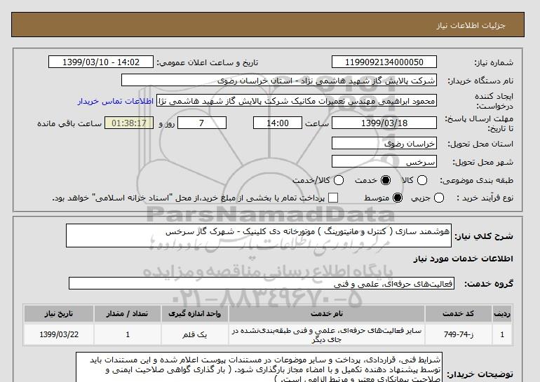 نام دستگاه خریدار:شرکت پالایش گاز شهید هاشمی نژاد - استان خراسان رضوی