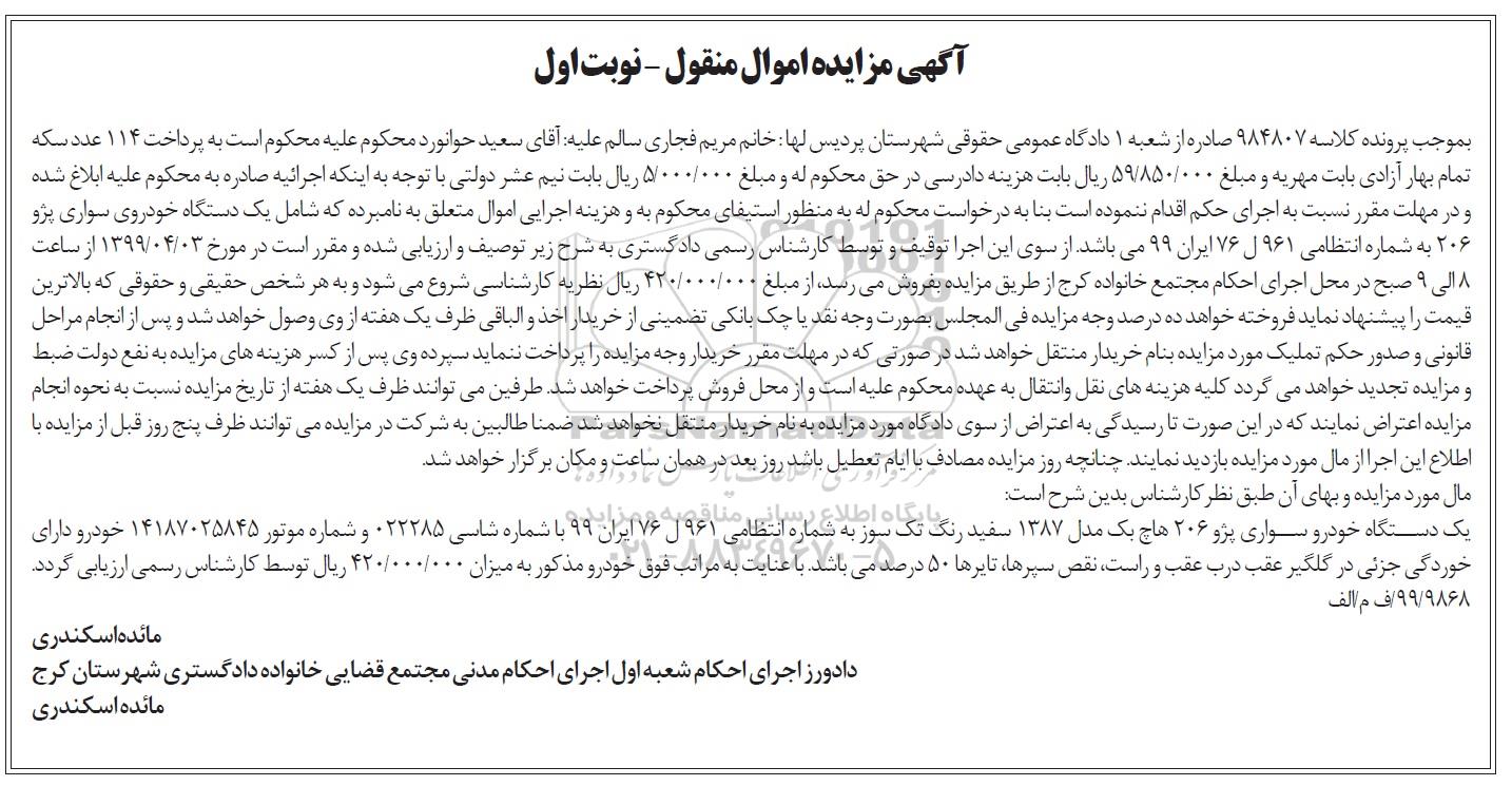 مزایده: یک دستگاه خودرو سواری پژو 206 هاچ بک مدل 1387 سفید رنگ به ارزش 420.000.000 ریال