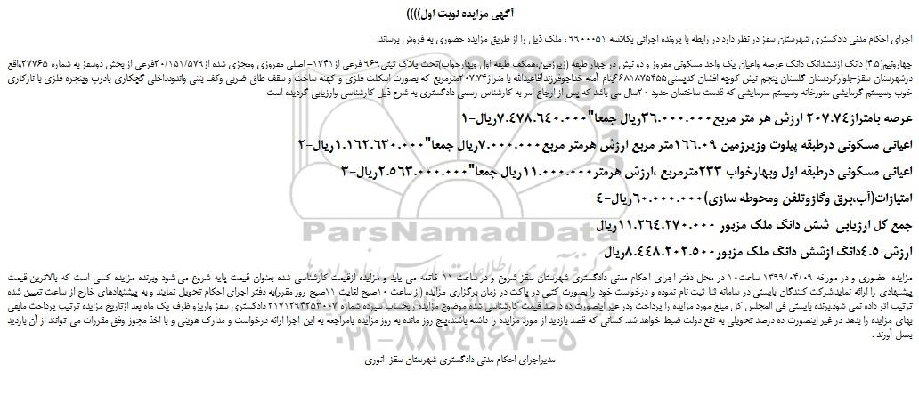 اجرای احکام مدنی دادگستری شهرستان سقز در نظر دارد در رابطه با پرونده اجرائی بکلاسه 9900051 ، ملک ذیل را از طریق مزایده حضوری به فروش برساند.