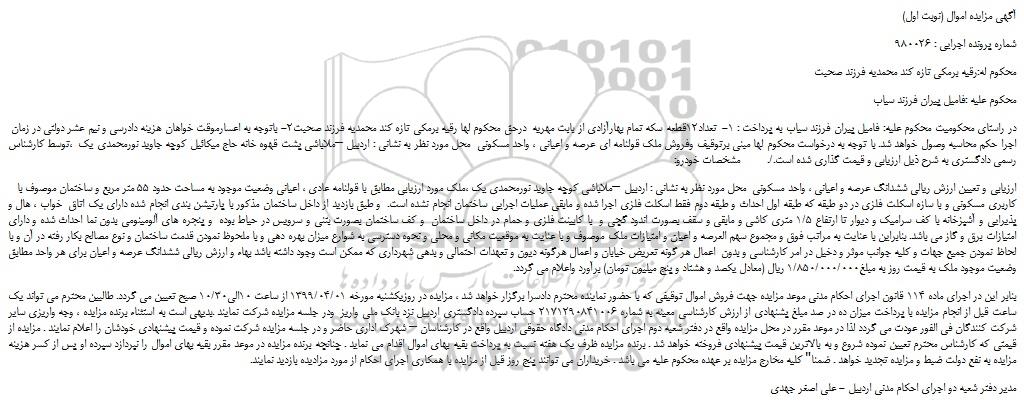 مزایده فروش ملک قولنامه ای ششدانگ عرصه و اعیانی ، واحد مسکونی , مزایده، مزایده فروش ملک قولنامه ای ششدانگ عرصه و اعیانی ، واحد مسکونی