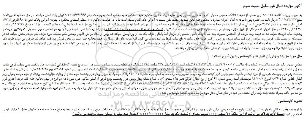 به موجب پرونده کلاسه 980135 رای صادره از شعبه 21دادگاه عمومی حقوقی کرج له کبری حسنی وغیره علیه فریده اخدری محکوم علیه محکوم علیه محکوم است به پرداخت مبلغ 28/221/666/666ریال بابت اصل خواسته در حق محکوم له وپرداخت مبلغ1/411/833/333ریال بابت نیم عشر دولتی با توجه به اینکه اجرائیه صادره به محکوم علیه ابلاغ شده ودر مهلت مقرر نسبت به اجرای حکم اقدام ننموده است بنا به در خواست محکوم له به منظور استیفای محکوم به وهزینه اجرایی پلاک ثبتی 46805فرعی از 162 اصلی مفروز ومجزی شده از 3137 فرعی از اصلی مذکور تئقیف شده از محکوم علیه توسط محکوم لهم متعلق به خانم فریده اخدری از سوی این اجرا توقیف وتوسط کارشناس رسمی به شرح ذیل توصیف وارزیابی شده ومقرر گردد در روز شنبه مورخ 99/3/31 از ساعت 12:30 الی 13:30 در محل اجرای احکام مدنی از طریق مزایده بفروش می رسد، مزایده از قیمت 30/000/000/000ریال (نسبت به 60سهم از 100 سهم مشاع از شش دانگ )طبق نظریه کارشناسی شروع می شود وبه هر شخص حقیقی وحقوقی که بالاترین قیمت را پیشنهاد نماید فروخته خواهد شد ده درصد وجه مزایده فی المجلس بصورت وجه نقد یا چک بانکی تضمینی از خریدار اخذ والباقی ظرف یک ماه از وی وصول خواهد شد وپس از انجام مراحل قانونی وصدور حکم تملیک مورد مزایده بنام خریدار منتقل خواهد شد در صورتیکه در مهلت مقرر خریدار وجه مزایده را پرداخت ننماید سپرده وی پس از کسر هزینه های مزایده به نفع دولت ضبط ومزایده تجدید می گردد کلیه هزینه های نقل وانتقال به عهده محکوم علیه است واز محل فروش پرداخت خواهد شد .طرفین می توانند ظرف یک هفته از تاریخ مزایده نسبت به نحوه انجام مزایده اعتراض نمایند که در این صورت تا رسیدگی به اعتراض از سوی دادگاه مورد مزایده به نام خریدار منتقل نخواهد شد ضمنا طالبین به شرکت در مزایده می توانند ظرف پنج روز قبل از مزایده با اطلاع این اجرا از مال مورد مزایده بازدید نمایند چنانچه روز مزایده مصادف با ایام تعطیل باشد روز بعد در همان ساعت ومکان برگزار خواهد شد .