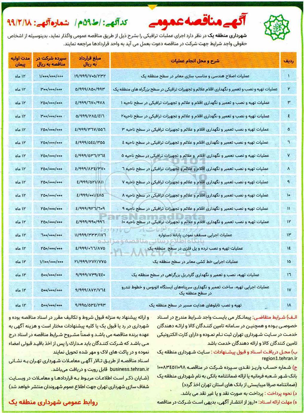 شهرداری منطقه یک تهران در نظر دارد اجرای عملیات ترافیکی را بشرح ذیل از طریق مناقصه عمومی واگذار نماید  بدینوسیله از اشخاص حقوقی واجد شرایط جهت شرکت در مناقصه دعوت به عمل می آید به واحد قراردادها مراجعه نمایند