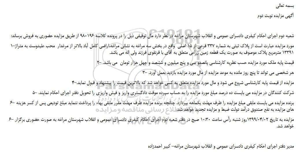 1-مورد مزایده عبارت است از پلاک ثبتی به شماره 337 قرعی از 15 اصلی واقع در بخش سه مراغه به نشانی مراغه،اراضی کامل آباد بالاتر از مرغدار محب علیدوست به متراژ 13391 مترمربع پلاک موصوف به صورت یک قطعه زمین زراعی متعلق به آقای با قرنقوی فرزند ولی اله می باشد.