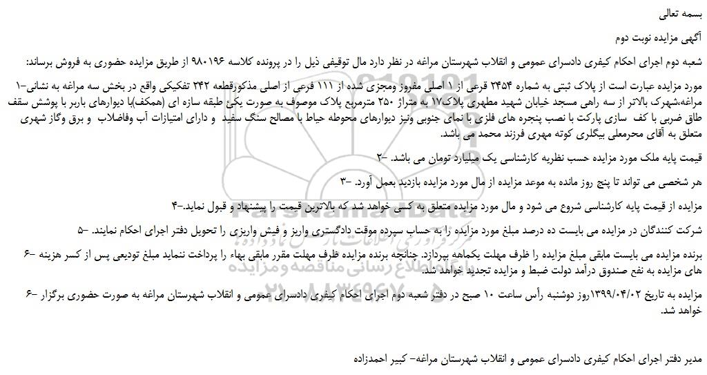 6- مزایده به تاریخ 1399/04/02روز دوشنبه رأس ساعت 10 صبح در دفتر شعبه دوم اجرای احکام کیفری دادسرای عمومی و انقلاب شهرستان مراغه به صورت حضوری برگزار خواهد شد.