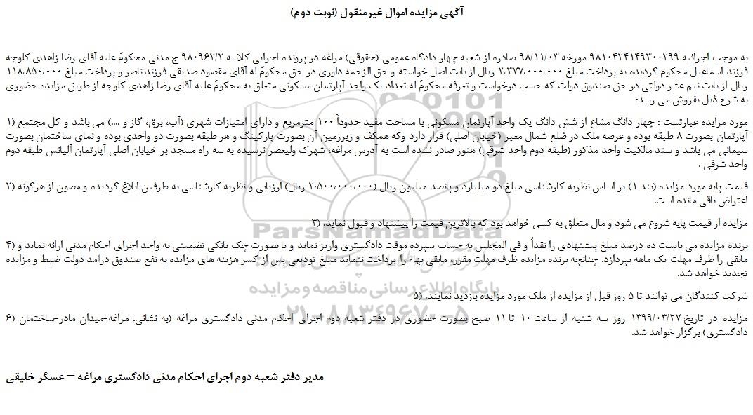 به موجب اجرائیه 9810424149300299 مورخه 98/11/03 صادره از شعبه چهار دادگاه عمومی (حقوقی) مراغه در پرونده اجرایی کلاسه 980962/2 ج مدنی محکومٌ علیه آقای رضا زاهدی کلوجه فرزند اسماعیل محکوم گردیده به پرداخت مبلغ 2،377،000،000 ریال از بابت اصل خواسته و حق الزحمه داوری در حق محکومٌ له آقای مقصود صدیقی فرزند ناصر و پرداخت مبلغ 118،850،000 ریال از بابت نیم عشر دولتی در حق صندوق دولت که حسب درخواست و تعرفه محکومٌ له تعداد یک واحد آپارتمان مسکونی متعلق به محکومٌ علیه آقای رضا زاهدی کلوجه از طریق مزایده حضوری به شرح ذیل بفروش می رسد: