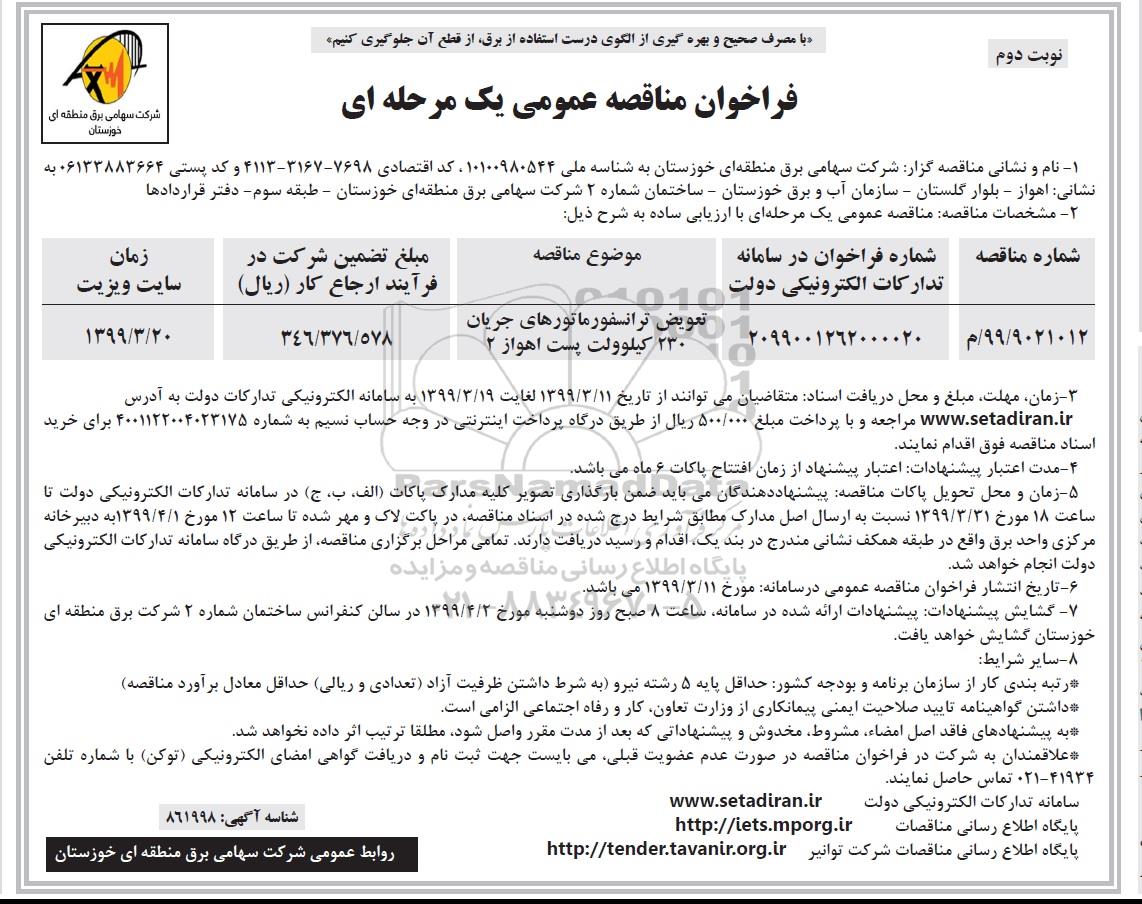 | 99/9021012/م | 2099001262000020 | تعویض ترانسفورماتورهای جریان 230 کیلوولت پست اهواز 2 | 346.376.578 | 1399.03.20 |