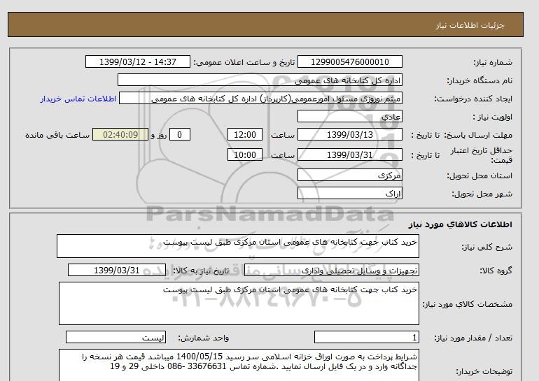 شرح کلی نیاز: خرید کتاب جهت کتابخانه های عمومی استان مرکزی طبق لیست پیوست