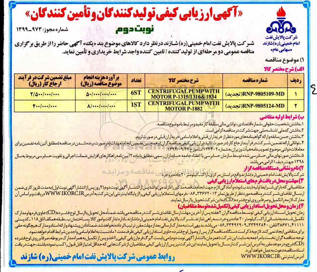 ارزیابی کیفی CENTRIFUGAL PUMP WITH MOTOR- نوبت دوم از کلیه افراد متخصص و شرکتها واجد شرایط دعوت به عمل میآید در مناقصه با کد خبرگزاری پارس نماد: 2436155 شرکت نمایند.