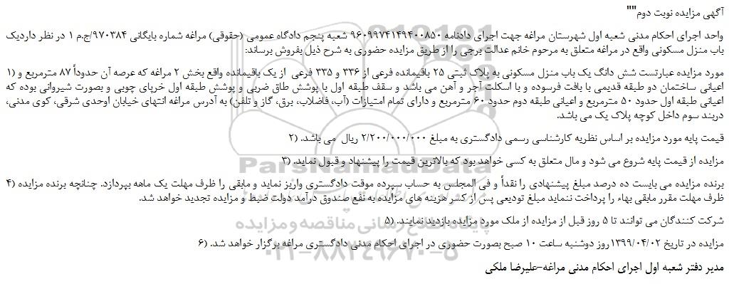 1) مورد مزایده عبارتست شش دانگ یک باب منزل مسکونی به پلاک ثبتی 25 باقیمانده فرعی از 336 و 335 فرعی از یک باقیمانده واقع بخش 2 مراغه که عرصه آن حدوداً 87 مترمربع و اعیانی ساختمان دو طبقه قدیمی با بافت فرسوده و با اسکلت آجر و آهن می باشد و سقف طبقه اول با پوشش طاق ضربی و پوشش طبقه اول خرپای چوبی و بصورت شیروانی بوده که اعیانی طبقه اول حدود 50 مترمربع و اعیانی طبقه دوم حدود 60 مترمربع و دارای تمام امتیازات (آب، فاضلاب، برق، گاز و تلفن) به آدرس مراغه انتهای خیابان اوحدی شرقی، کوی مدنی، دربند سوم داخل کوچه پلاک یک می باشد.