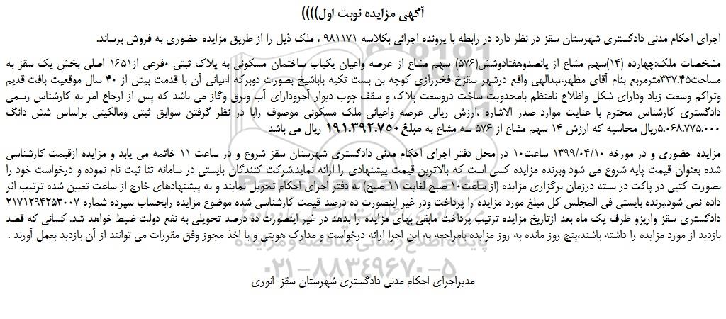 اجرای احکام مدنی دادگستری شهرستان سقز در نظر دارد در رابطه با پرونده اجرائی بکلاسه 981171 ، ملک ذیل را از طریق مزایده حضوری به فروش برساند.