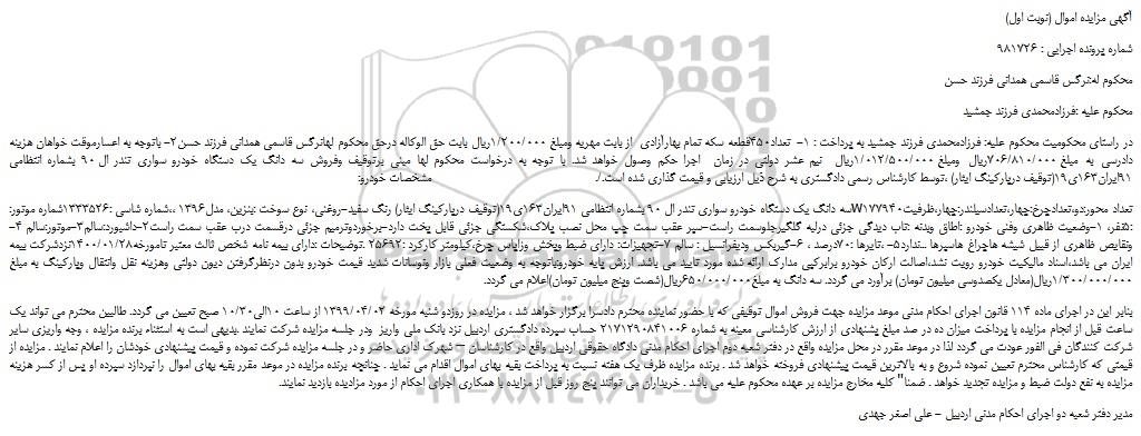در راستای محکومیت محکوم علیه: فرزادمحمدی فرزند جمشید به پرداخت : 1- تعداد450قطعه سکه تمام بهارآزادی از بابت مهریه ومبلغ 1/200/000ریال بابت حق الوکاله درحق محکوم لهانرگس قاسمی همدانی فرزند حسن2- باتوجه به اعسارموقت خواهان هزینه دادرسی به مبلغ 706/810/000ریال ومبلغ 1/012/500/000ریال نیم عشر دولتی در زمان اجرا حکم وصول خواهد شد. با توجه به درخواست محکوم لها مبنی برتوقیف وفروش سه دانگ یک دستگاه خودرو سواری تندر ال 90 بشماره انتظامی 91ایران163ی19(توقیف درپارکینگ ایثار) ،توسط کارشناس رسمی دادگستری به شرح ذیل ارزیابی و قیمت گذاری شده است./. مشخصات خودرو: