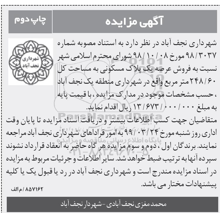 مزایده فروش عرصه یک پلاک مسکونی 248.60 مترمربع چاپ دوم