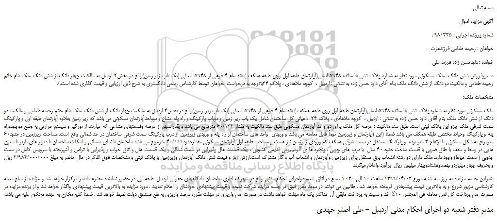 دستورفروش شش دانگ  ملک مسکونی مورد نظر به شماره پلاک ثبتی باقیمانده 5948 اصلی(آپارتمان طبقه اول روی طبقه همکف ) بانضمام 4 فرعی از 5948  اصلی (یک باب زیر زمین)واقع در بخش2 اردبیل به مالکیت چهار دانگ از شش دانگ ملک بنام خانم رحیمه طعامی و مالکیت دو دانگ از شش دانگ ملک بنام آقای داود حسن زاده به نشانی : اردبیل ،  کوچه ملاهادی ، پلاک 24باتوجه به درخواست  خواهان توسط کارشناس رسمی دادگستری به شرح ذیل ارزیابی و قیمت گذاری شده است./.