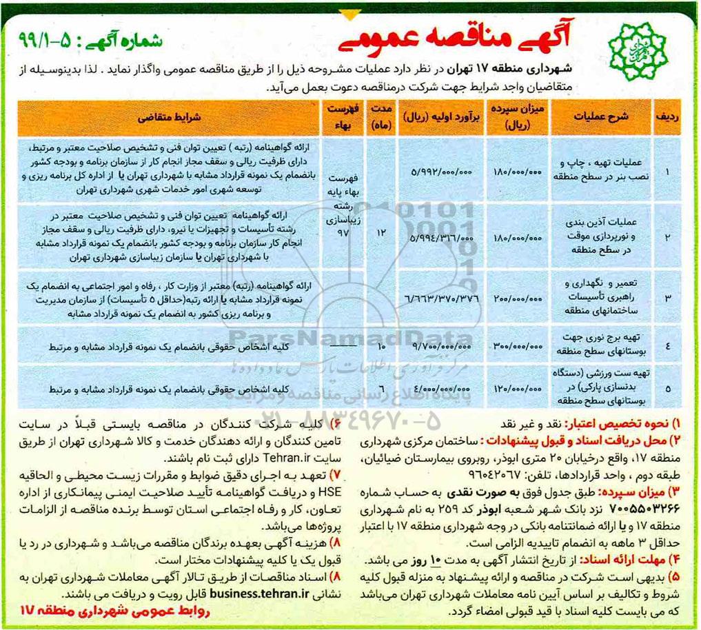 شهرداری منطقه 17 تهران درنظر دارد عملیات مشروحه ذیل را ا ز طریق مناقصه عمومی واگذار نماید لذا بدینوسیله از متقاضیان واجد شرایط جهت شرکت در مناقصه دعوت بعمل می آید