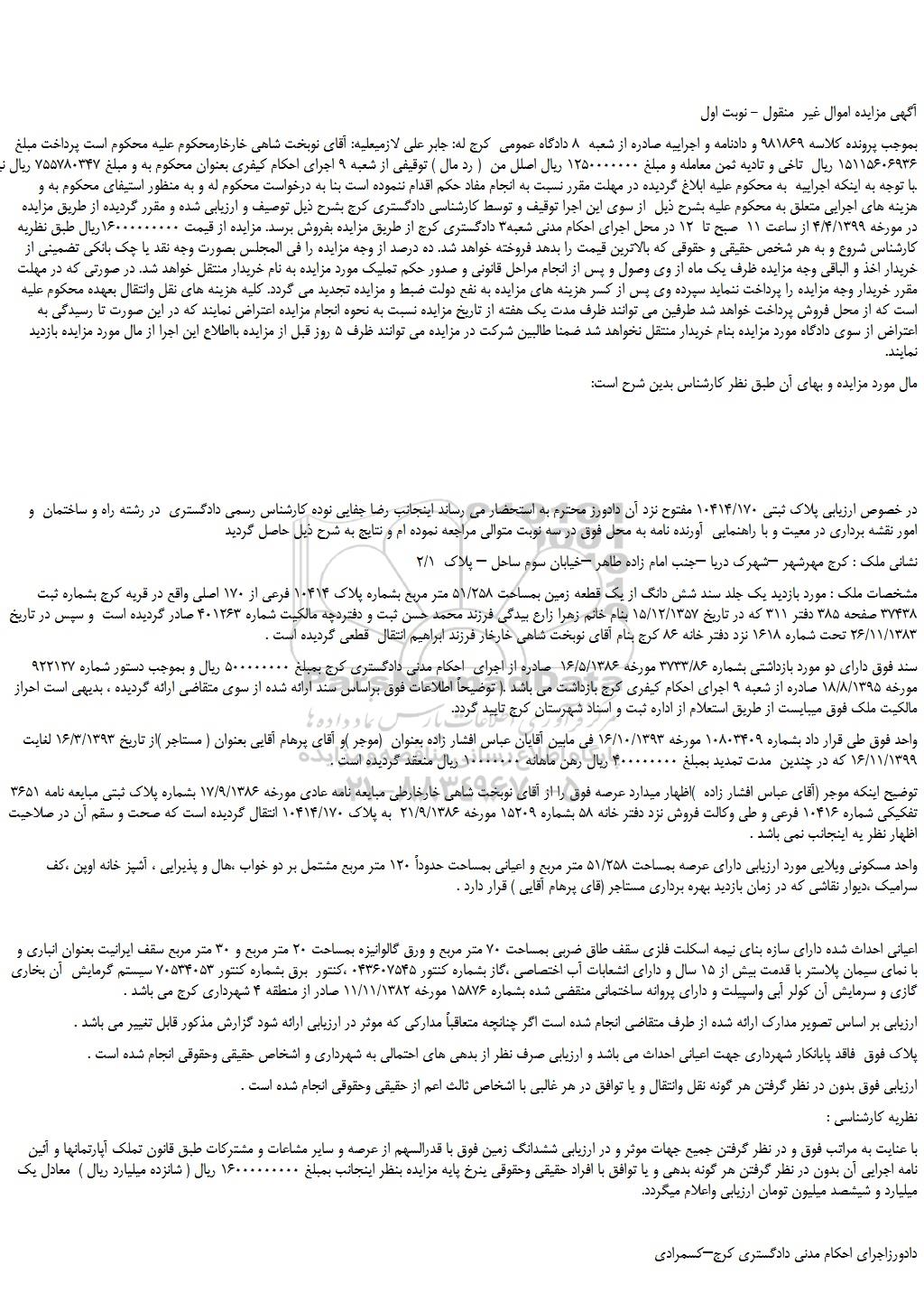 بموجب پرونده کلاسه 981869 و دادنامه و اجراییه صادره از شعبه 8 دادگاه عمومی کرج له: جابر علی لازمیعلیه: آقای نوبخت شاهی خارخارمحکوم علیه محکوم است پرداخت مبلغ 15115606936 ریال تاخی و تادیه ثمن معامله و مبلغ 1250000000 ریال اصلل من ( رد مال ) توقیفی از شعبه 9 اجرای احکام کیفری بعنوان محکوم به و مبلغ 755780347 ریال نیم عشر دولتی .با توجه به اینکه اجراییه به محکوم علیه ابلاغ گردیده در مهلت مقرر نسبت به انجام مفاد حکم اقدام ننموده است بنا به درخواست محکوم له و به منظور استیفای محکوم به و هزینه های اجرایی متعلق به محکوم علیه بشرح ذیل از سوی این اجرا توقیف و توسط کارشناسی دادگستری کرج بشرح ذیل توصیف و ارزیابی شده و مقرر گردیده از طریق مزایده در مورخه 4/4/1399 از ساعت 11 صبح تا 12 در محل اجرای احکام مدنی شعبه3 دادگستری کرج از طریق مزایده بفروش برسد. مزایده از قیمت 16000000000ریال طبق نظریه کارشناس شروع و به هر شخص حقیقی و حقوقی که بالاترین قیمت را بدهد فروخته خواهد شد. ده درصد از وجه مزایده را فی المجلس بصورت وجه نقد یا چک بانکی تضمینی از خریدار اخذ و الباقی وجه مزایده ظرف یک ماه از وی وصول و پس از انجام مراحل قانونی و صدور حکم تملیک مورد مزایده به نام خریدار منتقل خواهد شد. در صورتی که در مهلت مقرر خریدار وجه مزایده را پرداخت ننماید سپرده وی پس از کسر هزینه های مزایده به نفع دولت ضبط و مزایده تجدید می گردد. کلیه هزینه های نقل وانتقال بعهده محکوم علیه است که از محل فروش پرداخت خواهد شد طرفین می توانند ظرف مدت یک هفته از تاریخ مزایده نسبت به نحوه انجام مزایده اعتراض نمایند که در این صورت تا رسیدگی به اعتراض از سوی دادگاه مورد مزایده بنام خریدار منتقل نخواهد شد ضمنا طالبین شرکت در مزایده می توانند ظرف 5 روز قبل از مزایده بااطلاع این اجرا از مال مورد مزایده بازدید نمایند.