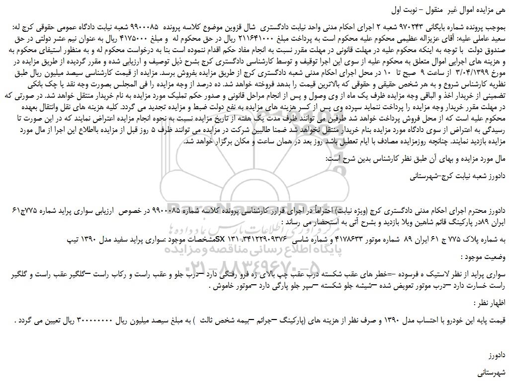 بموجب پرونده شماره بایگانی 970243 شعبه 2 اجرای احکام مدنی واحد نیابت دادگستری  شال قزوین موضوع کلاسه پرونده  9900085 شعبه نیابت دادگاه عمومی حقوقی کرج له:  سعید عاملی علیه: آقای عزیزاله عظیمی محکوم علیه محکوم است به پرداخت مبلغ 211641000 ریال در حق محکوم له  و مبلغ 4175000 ریال به عنوان نیم عشر دولتی در حق صندوق دولت  با توجه به اینکه محکوم علیه در مهلت قانونی در مهلت مقرر نسبت به انجام مفاد حکم اقدام ننموده است بنا به درخواست محکوم له و به منظور استیفای محکوم به و هزینه های اجرایی اموال متعلق به محکوم علیه از سوی این اجرا توقیف و توسط کارشناسی دادگستری کرج بشرح ذیل توصیف و ارزیابی شده و مقرر گردیده از طریق مزایده در مورخ 3/04/1399  از ساعت 9  صبح تا  10 در محل اجرای احکام مدنی شعبه دادگستری کرج از طریق مزایده بفروش برسد. مزایده از قیمت کارشناسی سیصد میلیون ریال طبق نظریه کارشناس شروع و به هر شخص حقیقی و حقوقی که بالاترین قیمت را بدهد فروخته خواهد شد. ده درصد از وجه مزایده را فی المجلس بصورت وجه نقد یا چک بانکی تضمینی از خریدار اخذ و الباقی وجه مزایده ظرف یک ماه از وی وصول و پس از انجام مراحل قانونی و صدور حکم تملیک مورد مزایده به نام خریدار منتقل خواهد شد. در صورتی که در مهلت مقرر خریدار وجه مزایده را پرداخت ننماید سپرده وی پس از کسر هزینه های مزایده به نفع دولت ضبط و مزایده تجدید می گردد. کلیه هزینه های نقل وانتقال بعهده محکوم علیه است که از محل فروش پرداخت خواهد شد طرفین می توانند ظرف مدت یک هفته از تاریخ مزایده نسبت به نحوه انجام مزایده اعتراض نمایند که در این صورت تا رسیدگی به اعتراض از سوی دادگاه مورد مزایده بنام خریدار منتقل نخواهد شد ضمنا طالبین شرکت در مزایده می توانند ظرف 5 روز قبل از مزایده بااطلاع این اجرا از مال مورد مزایده بازدید نمایند. چنانچه روزمزایده مصادف با ایام تعطیل باشد روز بعد در همان ساعت و مکان برگزار خواهد شد.