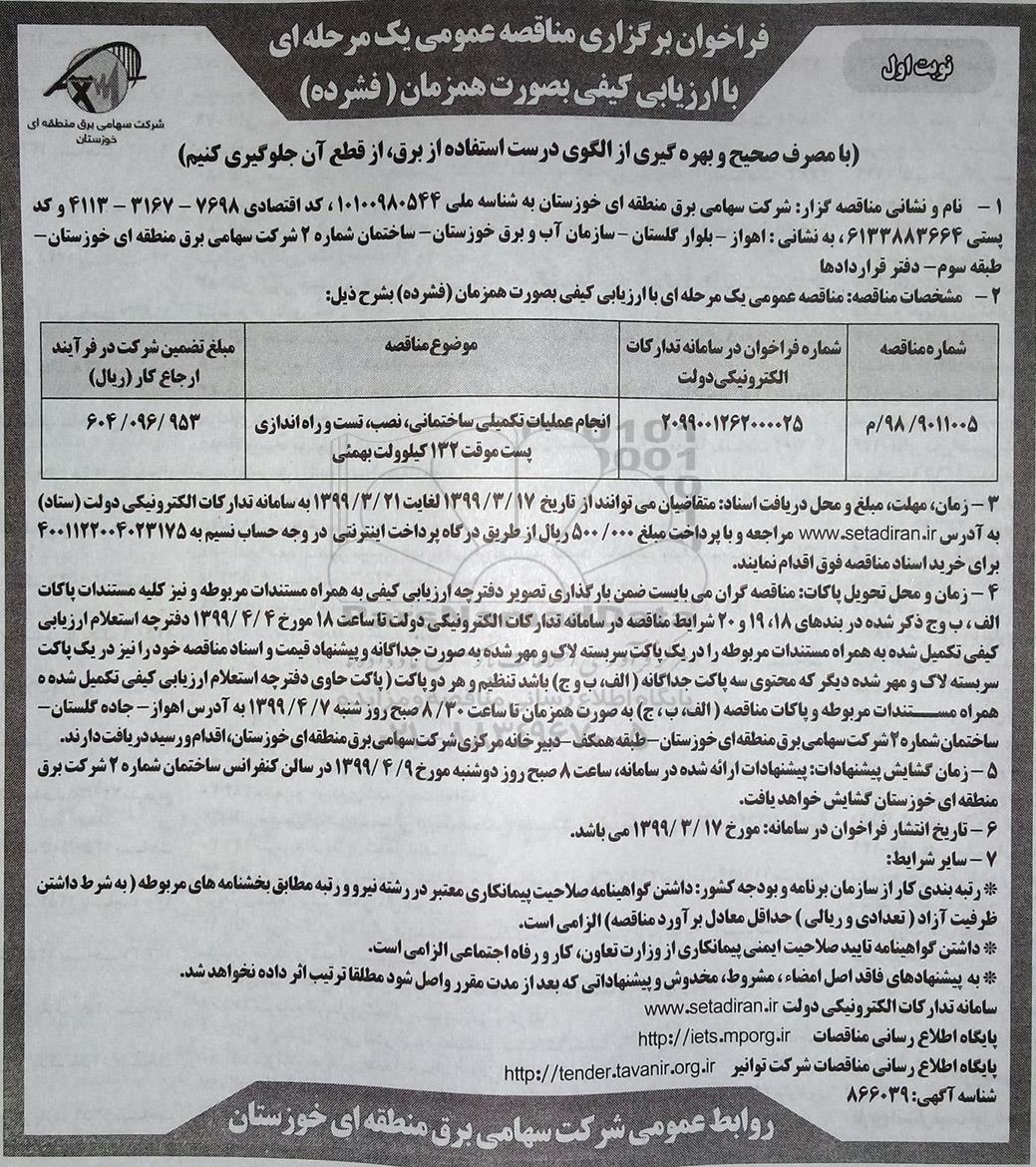 | 98/9011005/م | 2099001262000025 | انجام عملیات تکمیلی ساختمانی، نصب، تست و راه اندازی پست موقت 132 کیلوولت بهمئی |