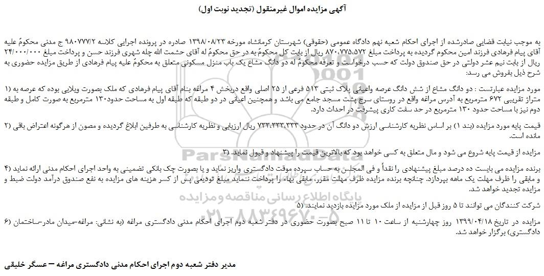 به موجب نیابت قضایی صادرشده از اجرای احکام شعبه نهم دادگاه عمومی (حقوقی) شهرستان کرمانشاه مورخه 1398/08/23 صادره در پرونده اجرایی کلاسه 980777/2 ج مدنی محکومٌ علیه آقای پیام فرهادی فرزند امین محکوم گردیده به پرداخت مبلغ 870،775،572 ریال از بابت کل محکومٌ به در حق محکومٌ له آقای حشمت الله چله شهری فرزند حسن و پرداخت مبلغ 24/000/000 ریال از بابت نیم عشر دولتی در حق صندوق دولت که حسب درخواست و تعرفه محکومٌ له دو دانگ مشاع یک باب منزل مسکونی متعلق به محکومٌ علیه پیام فرهادی از طریق مزایده حضوری به شرح ذیل بفروش می رسد: