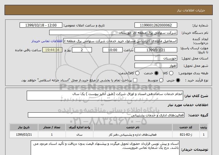 شرح کلی نیاز: انجام خدمات ساماندهی اسناد و اوراق شرکت (طبق آنالیز پیوست ) یک سال