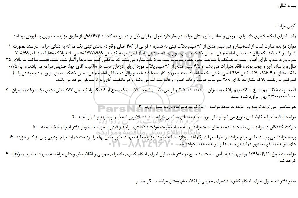 1-موارد مزایده عبارت است از الف)چهار و نیم سهم مشاع از 36 سهم پلاک ثبتی به شماره 1 فرعی از 486 اصلی واقع در بخش ثبتی یک مراغه به نشانی مراغه، در سند بصورت کاروانسرا قید شده که واقع در خیابان امام خمینی، میدان خشکبار سابق، روبروی درب پشتی پاساژ امیرکبیر به کدپستی 5514778989 می باشد.پلاک مشارالیه دارای 305/48 مترمربع عرصه و دارای اعیانی بصورت همکف با مساحت حدود هفتاد مترمربع بصورت 5 باب مغازه می باشد که سرقفلی کلیه مغازه ها واگذار شده است. قدمت ساخت بنا بالای 35 سال و با سازه آجر و چوب بوده و فاقد امتیازات می باشد. و 4/5 سهم مشاع از 36 سهم پلاک مورد ارزیابی درحال حاضر در مالکیت آقای جواد صدیقی مراغه می باشد. و ب) 0/75 دانگ مشاع از 6 دانگ پلاک ثبتی 487 اصلی بخش یک مراغه. در سند بصورت کاروانسرا قید شده و واقع در خیابان امام خمینی میدان خشکبار سابق روبروی درب پشتی پاساژ امیرکبیر می باشد. پلاک مشارالیه دارای 269 متر مربع عرصه و فاقد اعیانی و فاقدامتیازات می باشد. و در مالکیت آقای جواد صدیقی مراغه می باشد.