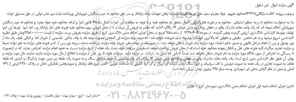 بنا به درخواست محکوم له و به منظور استیفای محکوم به و هزینه های اجرایی اموال متعلق به محکوم علیه و با توجه به موافقت این اجرا با اعمال ماده47 قانون اجرا و اینکه محکوم علیه جواد مجرد و محکوم له حیدر منگلیان شهربابکی اعلام نموده اند که یک واحد مغازه مشترک واقع در دهقان ویلا دوم نبش خیابان 14 پلاک 2دارند که حاضر به فروش آن میباشند تا از محل فروش سهم محکوم علیه هزینه های اخذ پایانکار و... اخذ شود توسط این اجرا توقیف وتوسط کارشناس دادگستری ارزیابی گردیده ومقرر گردیده در مورخه 4-4-1399 از ساعت8تا9 صبح در محل اجرای احکام مدنی دادگستری کرج از طریق مزایده بفروش برسد. مزایده از قیمت 998/000/000تومان طبق نظریه کارشناسی شروع میشود و به هر شخص حقیقی و حقوقی که بالاترین قیمت را پیشنهاد نماید فروخته خواهد شد . ده درصد وجه مزایده فی المجلس بصورت وجه نقد یا چک بانکی تضمینی از خریدار اخذ و الباقی ظرف یک ماه از وی وصول و پس از انجام مراحل قانونی و صدور حکم تملیک مورد مزایده بنام خریدار منتقل خواهد شد . در صورتیکه در مهلت مقرر خریدار وجه مزایده راپرداخت ننماید سپرده وی پس از کسر هزینه های مزایده به نفع دولت ضبط و مزایده تجدید میگردد.کلیه هزینه های نقل و انتقال بعهده محکوم علیه است.که از محل فروش پرداخت خواهد شد.طرفین میتوانند ظرف مدت یک هفته از تاریخ مزایده نسبت به نحوه انجام مزایده اعتراض نمایند که در اینصورت تا رسیدگی به اعتراض از سوی دادگاه مورد مزایده به نام خریدار منتقل نخواهد شد. ضمناً کسانی که تمایل به شرکت در مزایده دارند میتوانند ظرف 5 روز قبل از مزایده با اطلاع از مال مورد مزایده بازدید نمایند. مال مورد مزایده و بهای آن طبق نظر کارشناس بدین شرح است: یک واحد مغازه مشترک واقع در دهقان ویلا دوم نبش خیابان 14 پلاک 2در یک ساختمان 6 طبقه با نمای سنگ و به صورت یک طبقه زیر زمین جهت پارکینگ و انباری که طبقه هکف به صورت تجاری در یک دهنه به صورت دونبش با کف سرامیک و دیوار سنگ ودرب شیشه ای میرال و کر کره کشویی به مساحت تقریبی 50متر مربع فاقد پایانکار و صورتمجلس تفکیکی داخل در پلاک 3990 فرعی از 169 اصلی و بدون در نظر گرفتن بدهی ای شهرداری و...به مبلغ 998 میلیون تومان ارزیابی شده است