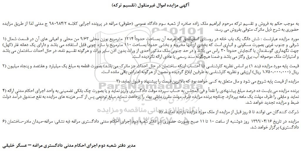 به موجب حکم به فروش و تقسیم ترکه مرحوم ابراهیم ملک زاده صادره از شعبه سوم دادگاه عمومی (حقوقی) مراغه در پرونده اجرایی کلاسه 980984/2 ج مدنی لذا از طریق مزایده حضوری به شرح ذیل ماترک متوفی بفروش می رسد:
