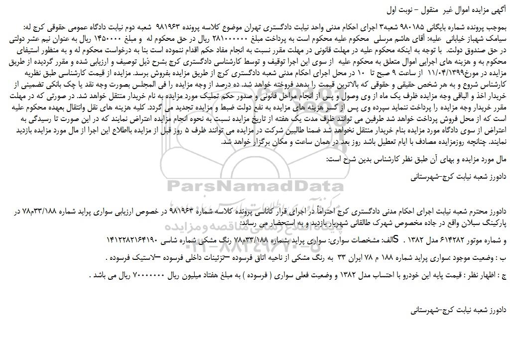 بموجب پرونده شماره بایگانی 980185 شعبه3 اجرای احکام مدنی واحد نیابت دادگستری تهران موضوع کلاسه پرونده 981963  شعبه دوم نیابت دادگاه عمومی حقوقی کرج له: سیامک شهباز خیابانی  علیه: آقای هاشم مرسلی  محکوم علیه محکوم است به پرداخت مبلغ 281000000 ریال در حق محکوم له  و مبلغ 1450000 ریال به عنوان نیم عشر دولتی در حق صندوق دولت.  با توجه به اینکه محکوم علیه در مهلت قانونی در مهلت مقرر نسبت به انجام مفاد حکم اقدام ننموده است بنا به درخواست محکوم له و به منظور استیفای محکوم به و هزینه های اجرایی اموال متعلق به محکوم علیه  از سوی این اجرا توقیف و توسط کارشناسی دادگستری کرج بشرح ذیل توصیف و ارزیابی شده و مقرر گردیده از طریق مزایده در مورخ11/04/1399  از ساعت 9 صبح تا  10 در محل اجرای احکام مدنی شعبه دادگستری کرج از طریق مزایده بفروش برسد. مزایده از قیمت کارشناسی طبق نظریه کارشناس شروع و به هر شخص حقیقی و حقوقی که بالاترین قیمت را بدهد فروخته خواهد شد. ده درصد از وجه مزایده را فی المجلس بصورت وجه نقد یا چک بانکی تضمینی از خریدار اخذ و الباقی وجه مزایده ظرف یک ماه از وی وصول و پس از انجام مراحل قانونی و صدور حکم تملیک مورد مزایده به نام خریدار منتقل خواهد شد. در صورتی که در مهلت مقرر خریدار وجه مزایده را پرداخت ننماید سپرده وی پس از کسر هزینه های مزایده به نفع دولت ضبط و مزایده تجدید می گردد. کلیه هزینه های نقل وانتقال بعهده محکوم علیه است که از محل فروش پرداخت خواهد شد طرفین می توانند ظرف مدت یک هفته از تاریخ مزایده نسبت به نحوه انجام مزایده اعتراض نمایند که در این صورت تا رسیدگی به اعتراض از سوی دادگاه مورد مزایده بنام خریدار منتقل نخواهد شد ضمنا طالبین شرکت در مزایده می توانند ظرف 5 روز قبل از مزایده بااطلاع این اجرا از مال مورد مزایده بازدید نمایند. چنانچه روزمزایده مصادف با ایام تعطیل باشد روز بعد در همان ساعت و مکان برگزار خواهد شد.