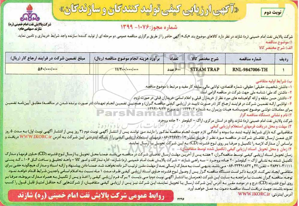 ارزیابی کیفی STEAM TRAP نوبت دوم , آگهی ارزیابی کیفی , ارزیابی کیفی STEAM TRAP نوبت دوم