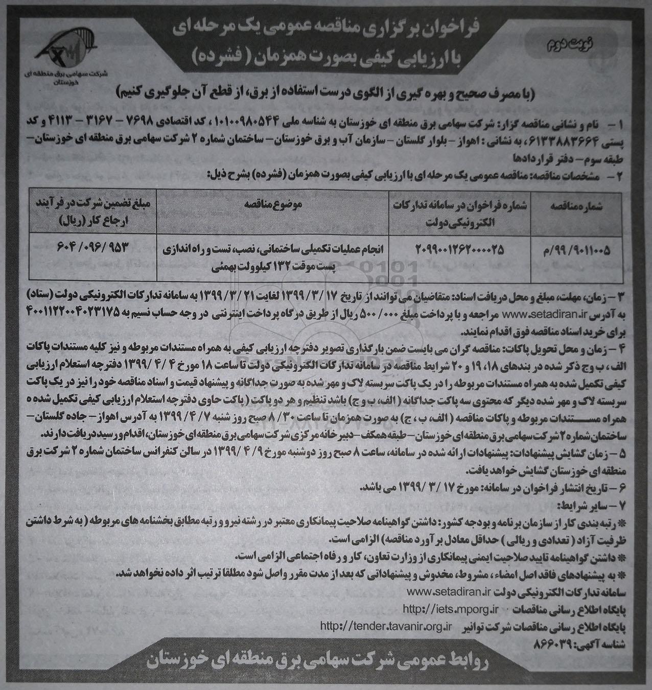 | 98/9011005/م | 2099001262000025 | انجام عملیات تکمیلی ساختمانی، نصب، تست و راه اندازی پست موقت 132 کیلوولت بهمئی |