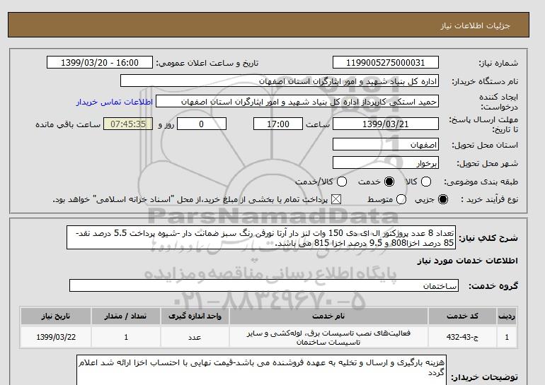 شرح کلی نیاز: تعداد 8 عدد پروژکتور ال ای دی 150 وات لنز دار آرتا نورفن رنگ سبز ضمانت دار -شیوه پرداخت 5.5 درصد نقد-85 درصد اخزا808 و 9.5 درصد اخزا 815 می باشد.