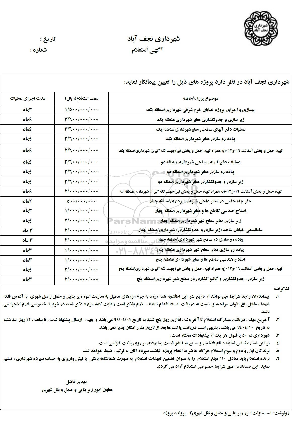 شهرداری نجف آباد در نظر دارد پروژه های ذیل را تعیین پیمانکار نماید