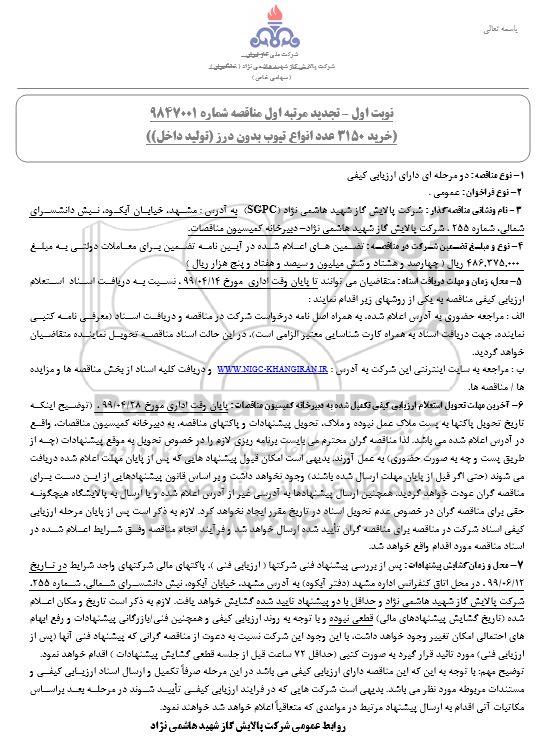 تجدید مناقصه خرید 3150 عدد انواع تیوب ..., مناقصه ، تجدید مناقصه خرید 3150 عدد انواع تیوب ...