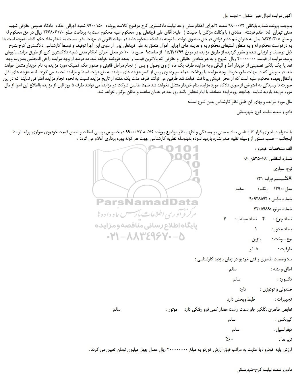 بموجب پرونده شماره بایگانی 9900072 شعبه 2اجرای احکام مدنی واحد نیابت دادگستری کرج موضوع کلاسه پرونده 9900150 شعبه اجرالی احکام دادگاه عمومی حقوقی شهید مدنی تهران له: خانم فرشته عمادی ( با وکالت مژگان با حقیقت ) علیه: آقای علی قربانعلی پور محکوم علیه محکوم است به پرداخت مبلغ 366806170 ریال در حق محکوم له و مبلغ 18340308 ریال به عنوان نیم عشر دولتی در حق صندوق دولت با توجه به اینکه محکوم علیه در مهلت قانونی در مهلت مقرر نسبت به انجام مفاد حکم اقدام ننموده است بنا به درخواست محکوم له و به منظور استیفای محکوم به و هزینه های اجرایی اموال متعلق به علی قربانعلی پور از سوی این اجرا توقیف و توسط کارشناسی دادگستری کرج بشرح ذیل توصیف و ارزیابی شده و مقرر گردیده از طریق مزایده در مورخ 15/4/1399 از ساعت9 صبح تا 10 در محل اجرای احکام مدنی شعبه دادگستری کرج از طریق مزایده بفروش برسد. مزایده از قیمت 40000000 ریال شروع و به هر شخص حقیقی و حقوقی که بالاترین قیمت را بدهد فروخته خواهد شد. ده درصد از وجه مزایده را فی المجلس بصورت وجه نقد یا چک بانکی تضمینی از خریدار اخذ و الباقی وجه مزایده ظرف یک ماه از وی وصول و پس از انجام مراحل قانونی و صدور حکم تملیک مورد مزایده به نام خریدار منتقل خواهد شد. در صورتی که در مهلت مقرر خریدار وجه مزایده را پرداخت ننماید سپرده وی پس از کسر هزینه های مزایده به نفع دولت ضبط و مزایده تجدید می گردد. کلیه هزینه های نقل وانتقال بعهده محکوم علیه است که از محل فروش پرداخت خواهد شد طرفین می توانند ظرف مدت یک هفته از تاریخ مزایده نسبت به نحوه انجام مزایده اعتراض نمایند که در این صورت تا رسیدگی به اعتراض از سوی دادگاه مورد مزایده بنام خریدار منتقل نخواهد شد ضمنا طالبین شرکت در مزایده می توانند ظرف 5 روز قبل از مزایده بااطلاع این اجرا از مال مورد مزایده بازدید نمایند. چنانچه روزمزایده مصادف با ایام تعطیل باشد روز بعد در همان ساعت و مکان برگزار خواهد شد.