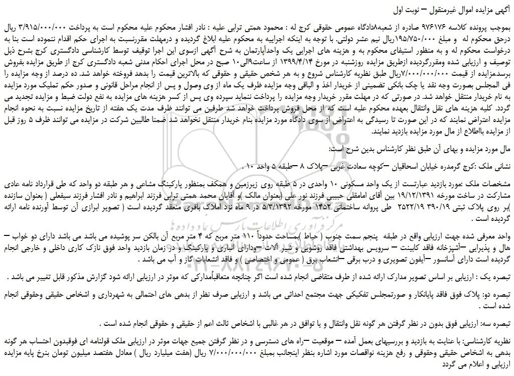 بموجب پرونده کلاسه 976176 صادره از شعبه8دادگاه عمومی حقوقی کرج له : محمود همتی ترابی علیه : نادر افشار محکوم علیه محکوم است به پرداخت 3/915/000/000 ریال درحق محکوم له  و مبلغ 195/750/000ریال نیم عشر دولتی. با توجه به اینکه اجراییه به محکوم علیه ابلاغ گردیده و درمهلت مقررنسبت به اجرای حکم اقدام ننموده است بنا به درخواست محکوم له و به منظور استیفای محکوم به و هزینه های اجرایی یک واحدآپارتمان به شرح آگهی ازسوی این اجرا توقیف توسط کارشناسی دادگستری کرج بشرح ذیل توصیف و ارزیابی شده ومقررگردیده ازطریق مزایده روزشنبه در مورخ 1399/4/14 از ساعت9الی10 صبح در محل اجرای احکام مدنی شعبه دادگستری کرج از طریق مزایده بفروش برسد.مزایده از قیمت 7/000/000/000ریال طبق نظریه کارشناس شروع و به هر شخص حقیقی و حقوقی که بالاترین قیمت را بدهد فروخته خواهد شد. ده درصد از وجه مزایده را فی المجلس بصورت وجه نقد یا چک بانکی تضمینی از خریدار اخذ و الباقی وجه مزایده ظرف یک ماه از وی وصول و پس از انجام مراحل قانونی و صدور حکم تملیک مورد مزایده به نام خریدار منتقل خواهد شد. در صورتی که در مهلت مقرر خریدار وجه مزایده را پرداخت ننماید سپرده وی پس از کسر هزینه های مزایده به نفع دولت ضبط و مزایده تجدید می گردد. کلیه هزینه های نقل وانتقال بعهده محکوم علیه است که از محل فروش پرداخت خواهد شد طرفین می توانند ظرف مدت یک هفته از تاریخ مزایده نسبت به نحوه انجام مزایده اعتراض نمایند که در این صورت تا رسیدگی به اعتراض از سوی دادگاه مورد مزایده بنام خریدار منتقل نخواهد شد ضمنا طالبین شرکت در مزایده می توانند ظرف 5 روز قبل از مزایده بااطلاع از مال مورد مزایده بازدید نمایند.