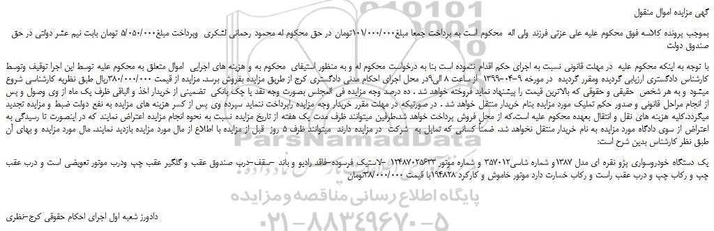 با توجه به اینکه محکوم علیه در مهلت قانونی نسبت به اجرای حکم اقدام ننموده است بنا به درخواست محکوم له و به منظور استیفای محکوم به و هزینه های اجرایی اموال متعلق به محکوم علیه توسط این اجرا توقیف وتوسط کارشناس دادگستری ارزیابی گردیده ومقرر گردیده در مورخه 9-04-1399 از ساعت 8 الی9در محل اجرای احکام مدنی دادگستری کرج از طریق مزایده بفروش برسد. مزایده از قیمت 380/000/000ریال طبق نظریه کارشناسی شروع میشود و به هر شخص حقیقی و حقوقی که بالاترین قیمت را پیشنهاد نماید فروخته خواهد شد . ده درصد وجه مزایده فی المجلس بصورت وجه نقد یا چک بانکی تضمینی از خریدار اخذ و الباقی ظرف یک ماه از وی وصول و پس از انجام مراحل قانونی و صدور حکم تملیک مورد مزایده بنام خریدار منتقل خواهد شد . در صورتیکه در مهلت مقرر خریدار وجه مزایده راپرداخت ننماید سپرده وی پس از کسر هزینه های مزایده به نفع دولت ضبط و مزایده تجدید میگردد.کلیه هزینه های نقل و انتقال بعهده محکوم علیه است.که از محل فروش پرداخت خواهد شد.طرفین میتوانند ظرف مدت یک هفته از تاریخ مزایده نسبت به نحوه انجام مزایده اعتراض نمایند که در اینصورت تا رسیدگی به اعتراض از سوی دادگاه مورد مزایده به نام خریدار منتقل نخواهد شد. ضمناً کسانی که تمایل به شرکت در مزایده دارند میتوانند ظرف 5 روز قبل از مزایده با اطلاع از مال مورد مزایده بازدید نمایند. مال مورد مزایده و بهای آن طبق نظر کارشناس بدین شرح است: