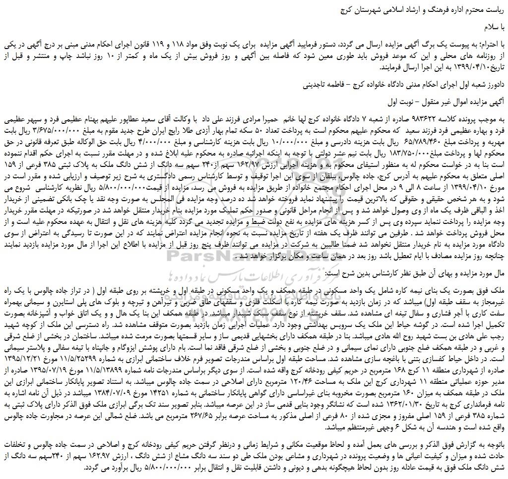 به موجب پرونده کلاسه 983622 صادره از شعبه 7 دادگاه خانواده کرج لها خانم  حمیرا مرادی فرزند علی داد  با وکالت آقای سعید عطاپور علیهم بهنام عظیمی فرد و سپهر عظیمی فرد و بهاره عظیمی فرد فرزند سعید  که محکوم علیهم محکوم است به پرداخت تعداد 50 سکه تمام بهار آزدی طلا رایج ایران طرح جدید مقوم به مبلغ 3/675/000/000 ریال بابت مهریه و پرداخت مبلغ 65/789/460  ریال بابت هزینه دادرسی و مبلغ 10/000/000 ریال بابت هزینه کارشناسی و مبلغ 4/000/000 ریال بابت حق الوکاله طبق تعرفه قانونی در حق محکوم لها و پرداخت مبلغ183/750/000 ریال بابت نیم عشر دولتی با توجه به اینکه اجرائیه صادره به محکوم علیه ابلاغ شده و در مهلت مقرر نسبت به اجرای حکم اقدام ننموده است بنا به در خواست محکوم له به منظور استیفای محکوم به و هزینه اجرایی ارزش 162/97 سهم از240 سهم سه دانگ از شش دانگ ملک به پلاک ثبتی 385 فرعی از 159 اصلی متعلق به محکوم علیهم به آدرس کرج، جاده چالوس، بیلقان از سوی این اجرا توقیف و توسط کارشناس رسمی دادگستری به شرح زیر توصیف و ارزیابی شده و مقرر است در مورخ 1399/04/10 از ساعت 8 الی 9 در محل اجرای احکام مجتمع خانواده از طریق مزایده به فروش می رسد، مزایده از قیمت5/800/000/000 ریال نظریه کارشناسی  شروع می شود و به هر شخص حقیقی و حقوقی که بالاترین قیمت را پیشنهاد نماید فروخته خواهد شد ده درصد وجه مزایده فی المجلس به صورت وجه نقد یا چک بانکی تضمینی از خریدار اخذ و الباقی ظرف یک ماه از وی وصول خواهد شد و پس از انجام مراحل قانونی و صدور حکم تملیک مورد مزایده بنام خریدار منتقل خواهد شد در صورتیکه در مهلت مقرر خریدار وجه مزایده را پرداخت ننماید سپرده وی پس از کسر هزینه های مزایده به نفع دولت ضبط و مزایده تجدید می گردد کلیه هزینه های نقل و انتقال به عهده محکوم علیه است و از محل فروش پرداخت خواهد شد . طرفین می توانند ظرف یک هفته از تاریخ مزایده نسبت به نحوه انجام مزایده اعتراض نمایند که در این صورت تا رسیدگی به اعتراض از سوی دادگاه مورد مزایده به نام خریدار منتقل نخواهد شد ضمنا طالبین به شرکت در مزایده می توانند ظرف پنج روز قبل از مزایده با اطلاع این اجرا از مال مورد مزایده بازدید نمایند چنانچه روز مزایده مصادف با ایام تعطیل باشد روز بعد در همان ساعت و مکان برگزار خواهد شد .