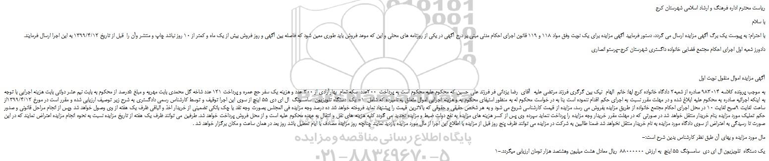 به موجب پرونده کلاسه 983014 صادره از شعبه2 دادگاه خانواده کرج لها: خانم الهام نیک بین گرگری فرزند مرتضی علیه آقای رضا یزدانی فر فرزند علی حسین که محکوم علیه محکوم است به پرداخت 200عدد سکه تمام بهارآزادی از 300 عدد و هزینه یک سفر حج عمره و پرداخت 121 عدد شاخه گل محمدی بابت مهریه و مبلغ 5درصد از محکوم به بابت نیم عشر دولتی بابت هزینه اجرایی با توجه به اینکه اجرائیه صادره به محکوم علیه ابلاغ شده و در مهلت مقرر نسبت به اجرای حکم اقدام ننموده است بنا به در خواست محکوم له به منظور استیفای محکوم به و هزینه اجرایی اموال متعلق به نامبرده که شامل 1- یک دستگاه تلویزیون سامسونگ ال ای دی 55 اینچ از سوی این اجرا توقیف و توسط کارشناس رسمی دادگستری به شرح زیر توصیف ارزیابی شده و مقرر است در مورخ 1399/4/12از ساعت لغایت 9صبح لغایت 10 در محل اجرای احکام مجتمع خانواده از طریق مزایده بفروش می رسد، مزایده از قیمت کارشناسی شروع می شود و به هر شخص حقیقی و حقوقی که بالاترین قیمت را پیشنهاد نماید فروخته خواهد شد ده درصد وجه مزایده فی المجلس بصورت وجه نقد یا چک بانکی تضمینی از خریدار اخذ و الباقی ظرف یک هفته از وی وصول خواهد شد وپس از انجام مراحل قانونی و صدور حکم تملیک مورد مزایده بنام خریدار منتقل خواهد شد در صورتی که در مهلت مقرر خریدار وجه مزایده را پرداخت ننماید سپرده وی پس از کسر هزینه های مزایده به نفع دولت ضبط و مزایده تجدید می گردد کلیه هزینه های نقل و انتقال به عهده محکوم علیه است و از محل فروش پرداخت خواهد شد. طرفین می توانند ظرف یک هفته از تاریخ مزایده نسبت به نحوه انجام مزایده اعتراض نمایند که در این صورت تا رسیدگی به اعتراض از سوی دادگاه مورد مزایده به نام خریدار منتقل نخواهد شد ضمنا طالبین به شرکت در مزایده می توانند ظرف پنج روز قبل از مزایده با اطلاع این اجرا از مال مورد مزایده بازدید نمایند چنانچه روز مزایده مصادف با ایام تعطیل باشد روز بعد در همان ساعت و مکان برگزار خواهد شد .