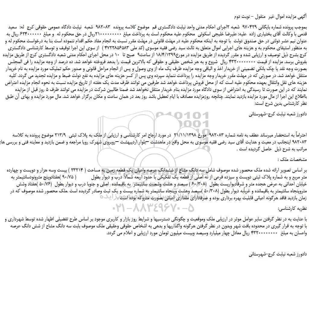 بموجب پرونده شماره بایگانی 970429  شعبه 2اجرای احکام مدنی واحد نیابت دادگستری قم  موضوع کلاسه پرونده  982083  شعبه  نیابت دادگاه عمومی حقوقی کرج  له:  سعید قدمی با وکالت آقای بختیاری زاده  علیه: علیرضا خلیجی اسکوئی  محکوم علیه محکوم است به پرداخت مبلغ 21000000000ریال در حق محکوم له  و مبلغ 624000000 ریال به عنوان نیم عشر دولتی در حق صندوق دولت  با توجه به اینکه محکوم علیه در مهلت قانونی در مهلت مقرر نسبت به انجام مفاد حکم اقدام ننموده است بنا به درخواست محکوم له و به منظور استیفای محکوم به و هزینه های اجرایی اموال متعلق به ثالث سید رضی فقیه موسوی (کد ملی 4722856583 )  از سوی این اجرا توقیف و توسط کارشناسی دادگستری کرج بشرح ذیل توصیف و ارزیابی شده و مقرر گردیده از طریق مزایده در مورخ18/4/1399 از ساعت9  صبح تا  10 در محل اجرای احکام مدنی شعبه دادگستری کرج از طریق مزایده بفروش برسد. مزایده از قیمت 43200000000 ریال  شروع و به هر شخص حقیقی و حقوقی که بالاترین قیمت را بدهد فروخته خواهد شد. ده درصد از وجه مزایده را فی المجلس بصورت وجه نقد یا چک بانکی تضمینی از خریدار اخذ و الباقی وجه مزایده ظرف یک ماه از وی وصول و پس از انجام مراحل قانونی و صدور حکم تملیک مورد مزایده به نام خریدار منتقل خواهد شد. در صورتی که در مهلت مقرر خریدار وجه مزایده را پرداخت ننماید سپرده وی پس از کسر هزینه های مزایده به نفع دولت ضبط و مزایده تجدید می گردد. کلیه هزینه های نقل وانتقال بعهده محکوم علیه است که از محل فروش پرداخت خواهد شد طرفین می توانند ظرف مدت یک هفته از تاریخ مزایده نسبت به نحوه انجام مزایده اعتراض نمایند که در این صورت تا رسیدگی به اعتراض از سوی دادگاه مورد مزایده بنام خریدار منتقل نخواهد شد ضمنا طالبین شرکت در مزایده می توانند ظرف 5 روز قبل از مزایده بااطلاع این اجرا از مال مورد مزایده بازدید نمایند. چنانچه روزمزایده مصادف با ایام تعطیل باشد روز بعد در همان ساعت و مکان برگزار خواهد شد. مال مورد مزایده و بهای آن طبق نظر کارشناس بدین شرح است: