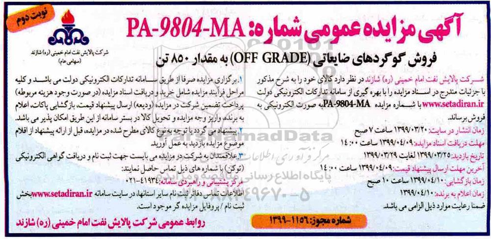 شرکت پالایش نفت امام خمینی (ره) شازند در نظر دارد کالای خود را به شرح مذکور با جزئیات مندرج در اسناد مزایده را با بهره گیری از سامانه تدارکات الکترونیکی دولت با شماره مزایده PA-9804-MA  به صورت الکترونیکی به فروش برساند.