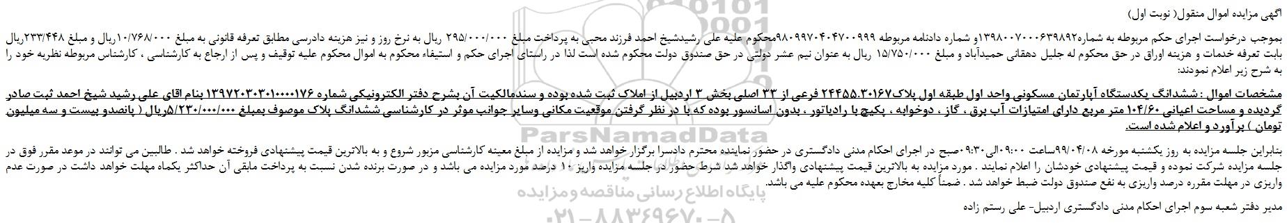 شعبه صادر کننده:شعبه سوم اجرای احکام مدنی دادگستری شهرستان اردبیل