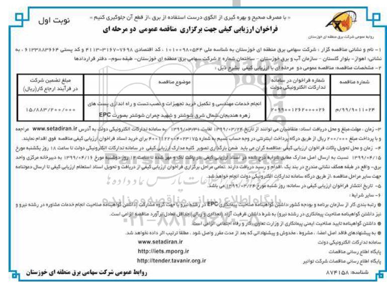2099001262000026 | انجام خدمات مهندسی و تکمیل خرید تجهیزات و نصب، تست و راه اندازی پست های زهره هندیجان شمال شرق شوشتر و شهید چمران شوشتر بصورت EPC |