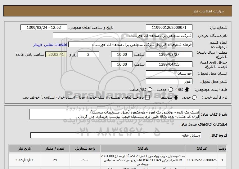 شرح کلی نیاز: تشک یک نفره - روتختی یک نفره - پتو یکنفره (طبق مشخصات پیوست)