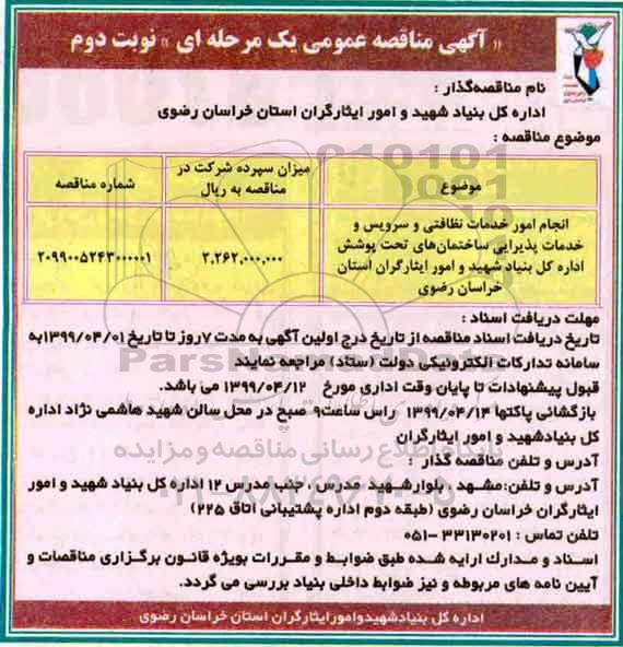| انجام امور خدمات نظافتی و سرویس و خدمات پذیرایی ساختمان های تحت پوشش اداره کل بنیاد شهید و امور ایثارگران استان خراسان رضوی | 2.262.000.000 | 2099005243000001 |