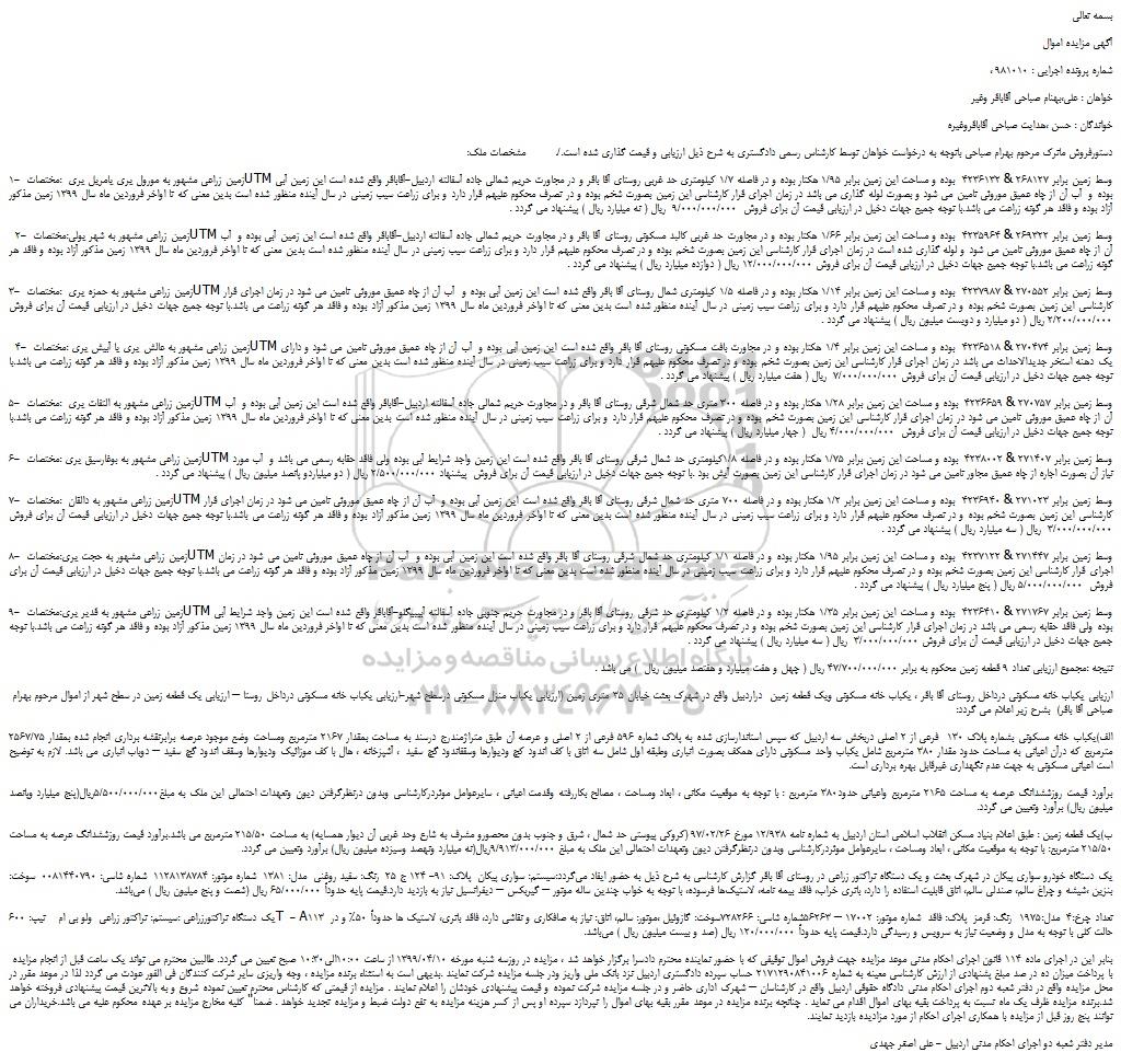 ارزیابی یکباب خانه مسکونی درداخل روستای آقا باقر ، یکباب خانه مسکونی ویک قطعه زمین دراردبیل واقع در شهرک بعثت خیابان 35 متری زمین (ارزیابی یکباب منزل مسکونی درسطح شهر-ارزیابی یکباب خانه مسکونی درداخل روستا – ارزیابی یک قطعه زمین در سطح شهر از اموال مرحوم بهرام صباحی آقا باقر) بشرح زیر اعلام می گردد: